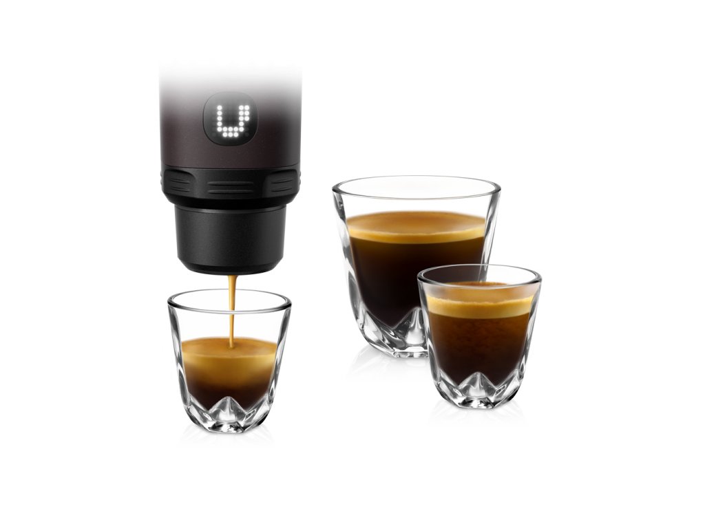 Univerzální použití: kompatibilní s mletou kávou i kapslemi Nespresso. Na jedno nabití baterie připraví až 5 šálků espressa a díky USB-C konektoru se dobije přibližně za 2,5 hodiny. Veškeré příslušenství – šálky, odměrka, trychtýř i kartáček – se vejde přímo do těla kávovaru, takže je vždy bezpečně uložené a po ruce.